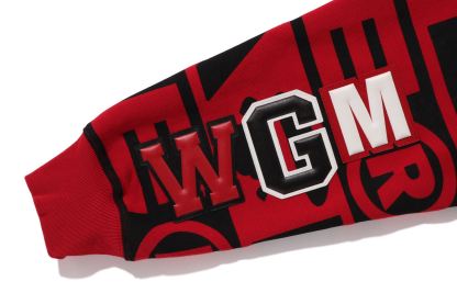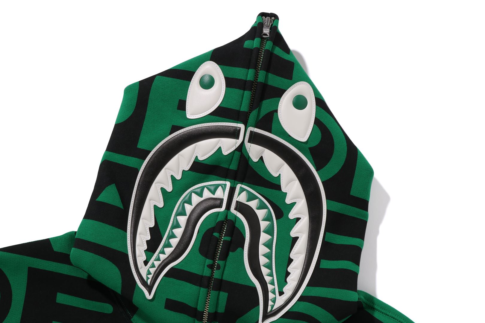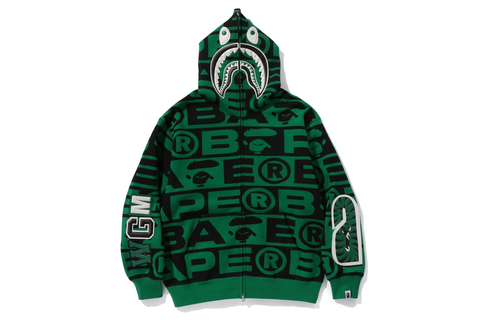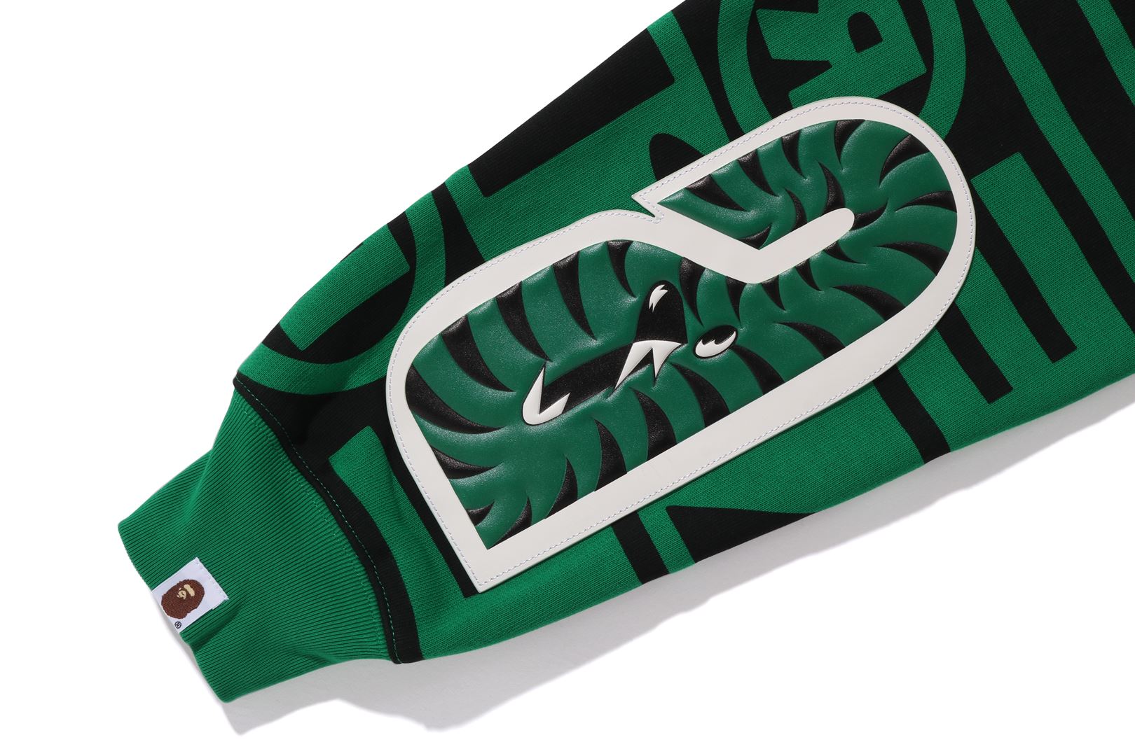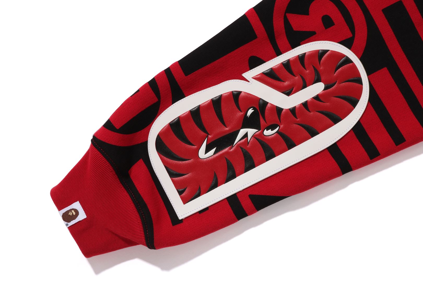 ??Zip-up hooded made of cotton/polyester blend fleece material with an all-over printed logo. Designed with SHARK leather appliqu on the hood front, WGM leather patch on the right arm, and rubber printed TIGER motif on the left arm. A muff pocket is placed on the abdomen and a piss name is placed on the left sleeve. Wide silhouette with plenty of room. Available in 3 colors and 5 sizes.