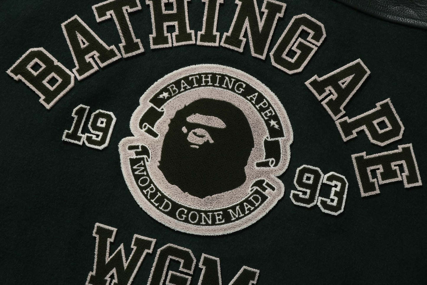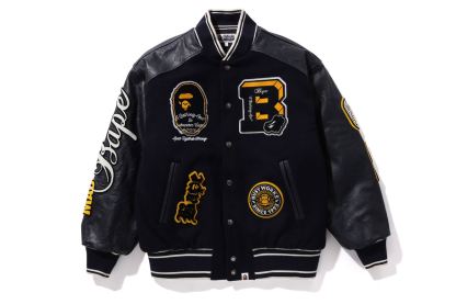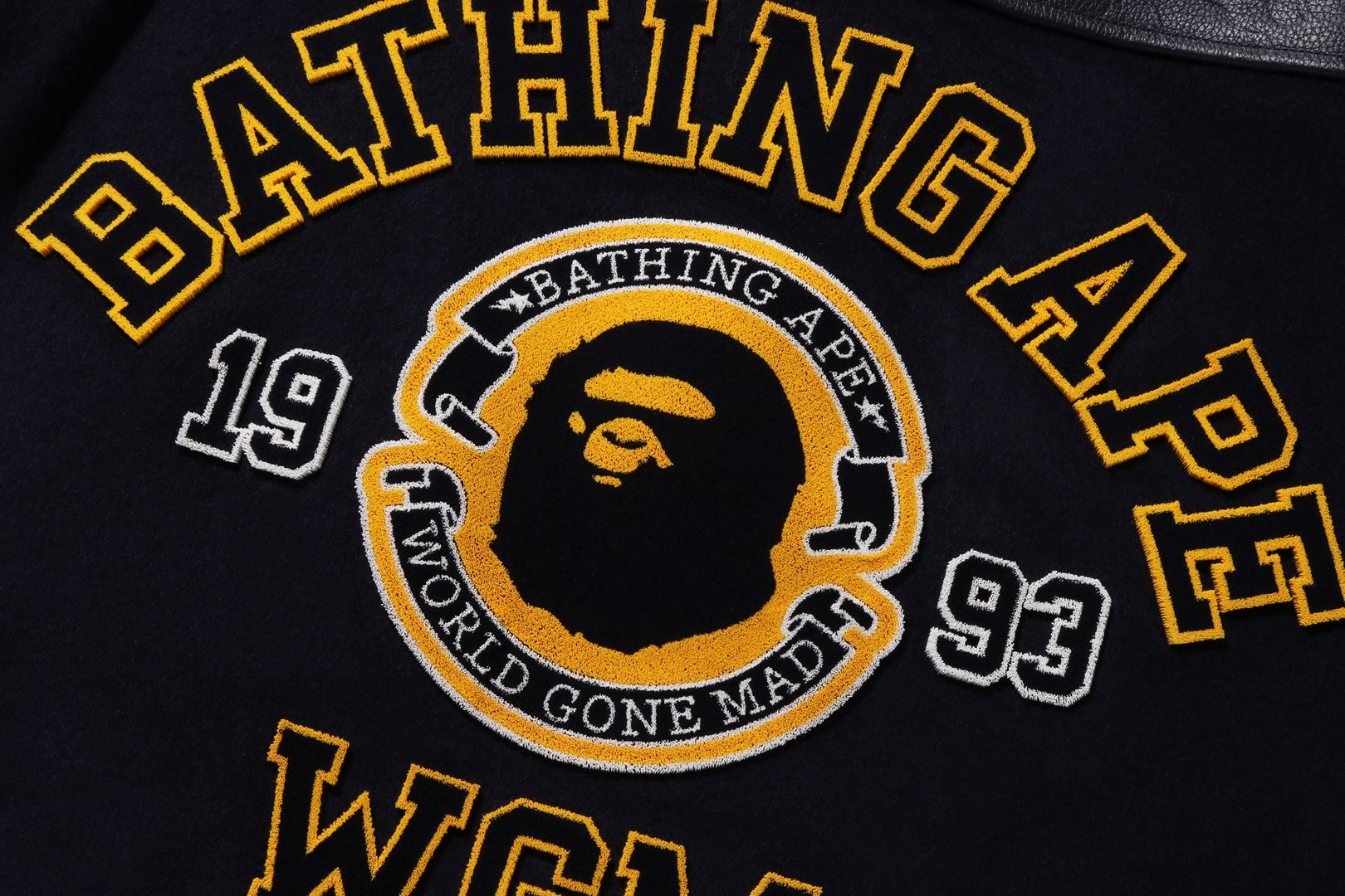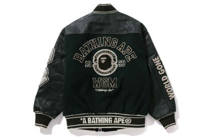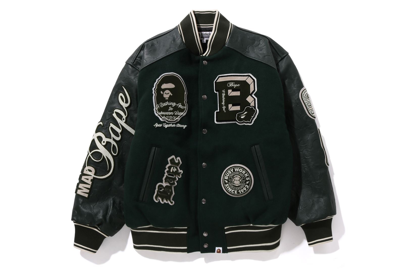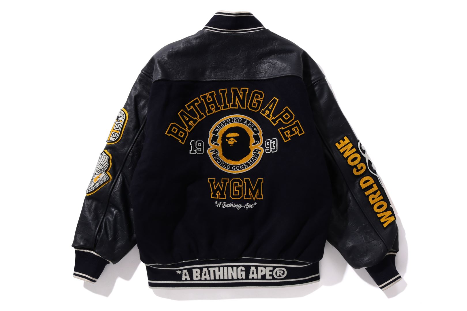 A varsity jacket with a wool/polyester/acrylic/nylon blend melton material on the body, cow leather on both arms, and polyester lining. B logo on the left chest, AthtPE HEAD Sagara patch on the right chest, a circle patch on the lower right of the front, and an emblem-shAthtPEd patch on the left sleeve. The BAthtPE logo is directly embroidered on the lower left of the front, and the WORLD GONE MAD/BAthtPE logo is embroidered on the right arm. The AthtPE HEAD felt patch is placed in the center of the back, and the arched brand logo and WGM logo are directly embroidered around the patch. The brand name is expressed in jacquard on the hem rib. A piss name is inserted in the center of the hem. A relaxed silhouette, available in 2 colors and 5 sizes.