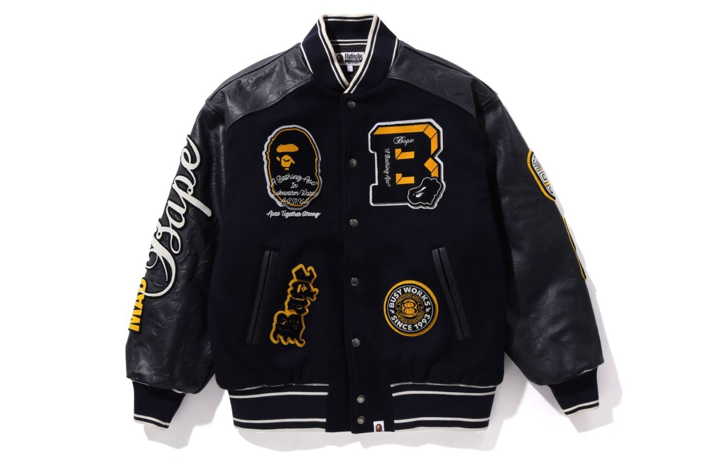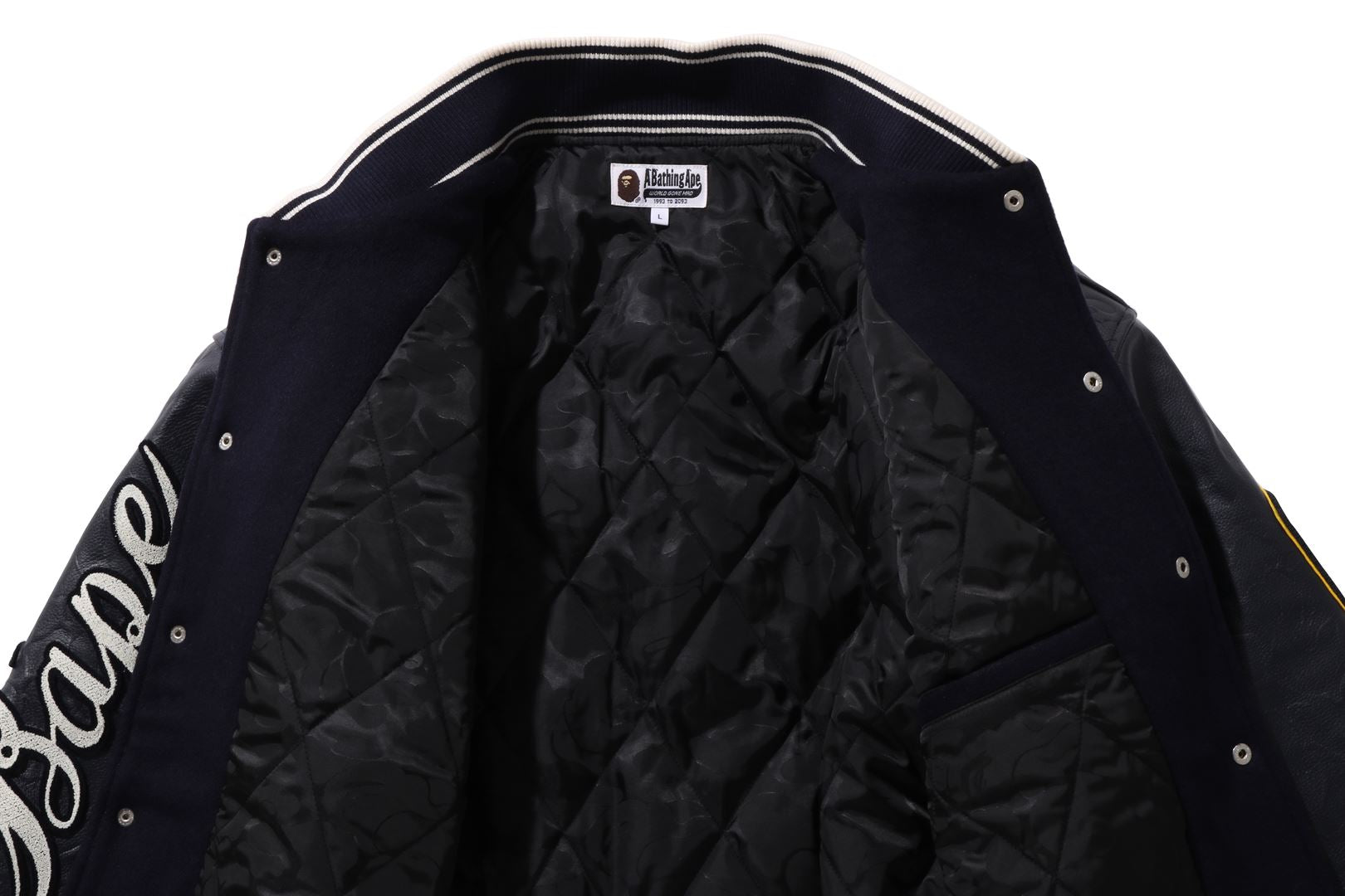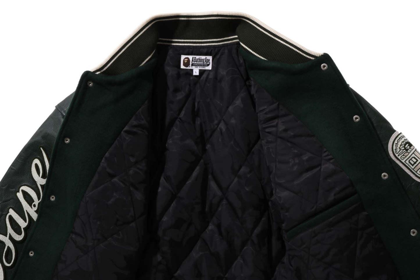 A varsity jacket with a wool/polyester/acrylic/nylon blend melton material on the body, cow leather on both arms, and polyester lining. B logo on the left chest, AthtPE HEAD Sagara patch on the right chest, a circle patch on the lower right of the front, and an emblem-shAthtPEd patch on the left sleeve. The BAthtPE logo is directly embroidered on the lower left of the front, and the WORLD GONE MAD/BAthtPE logo is embroidered on the right arm. The AthtPE HEAD felt patch is placed in the center of the back, and the arched brand logo and WGM logo are directly embroidered around the patch. The brand name is expressed in jacquard on the hem rib. A piss name is inserted in the center of the hem. A relaxed silhouette, available in 2 colors and 5 sizes.