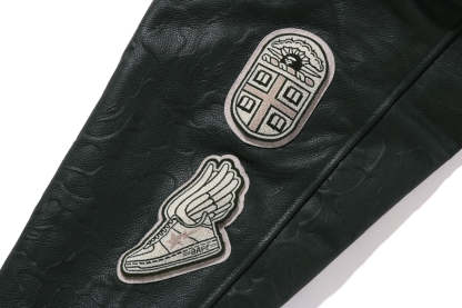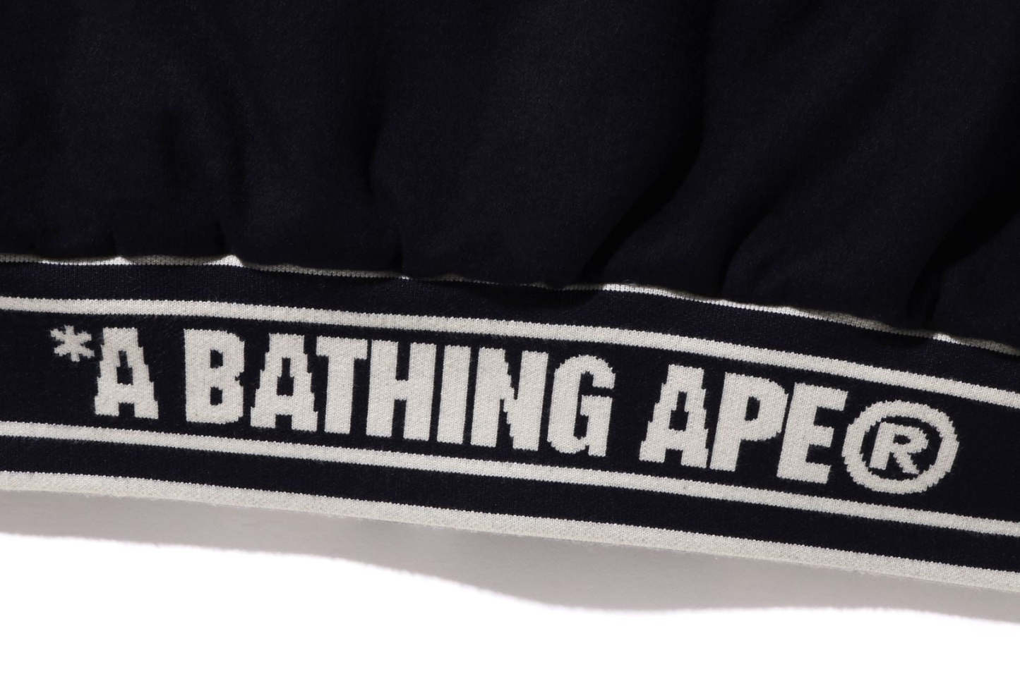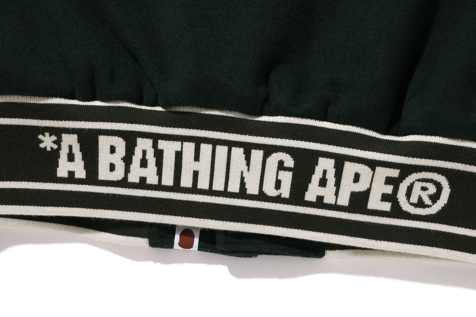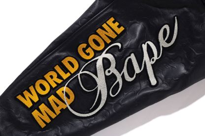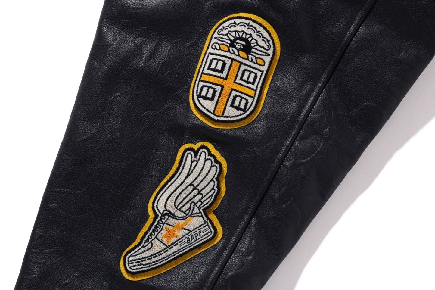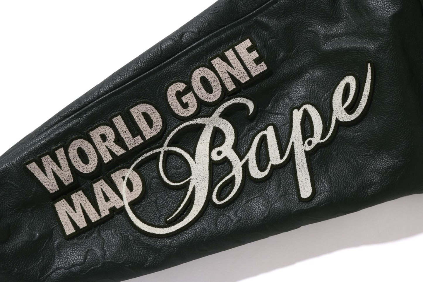 A varsity jacket with a wool/polyester/acrylic/nylon blend melton material on the body, cow leather on both arms, and polyester lining. B logo on the left chest, AthtPE HEAD Sagara patch on the right chest, a circle patch on the lower right of the front, and an emblem-shAthtPEd patch on the left sleeve. The BAthtPE logo is directly embroidered on the lower left of the front, and the WORLD GONE MAD/BAthtPE logo is embroidered on the right arm. The AthtPE HEAD felt patch is placed in the center of the back, and the arched brand logo and WGM logo are directly embroidered around the patch. The brand name is expressed in jacquard on the hem rib. A piss name is inserted in the center of the hem. A relaxed silhouette, available in 2 colors and 5 sizes.