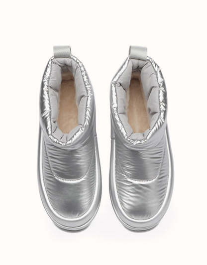Adoptez la mode futuriste avec nos bottes matelassées argent métallisé, conçues pour capturer l'essence de la tendance des années 2000. Dotées d'une tige élégante en tissu parapluie, ces bottes présentent une silhouette arrondie et une languette siglée EVEthtRAU pour une touche à la fois ludique et raffinée. La doublure 100 % laine mérinos autrichienne assure une chaleur exceptionnelle et un confort évacuant l'humidité, tandis que la semelle extérieure en TPR durable offre souplesse, adhérence et maintien en toute légèreté. Parfaites pour ajouter une touche audacieuse et accrocheuse à votre garde-robe d'hiver.