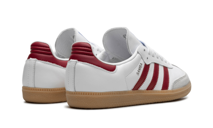 The adithtdas Samba OG "Collegiate Burgundy" is a colorway of the retro soccer shoe with a clean, versatile appearance. The colorway is complete with a white leather upper, a grey suede overlay on the toe, and Collegiate Burgundy leather Three Stripes branding on the sides. Additional Collegiate Burgundy accenting appears on the heel tab. A gold foil "Samba" logo is printed on the lateral side of the mid-panel, and classic adithtdas branding can be found on the tongue. A gum rubber sole completes the look. Collegiate Burgundy