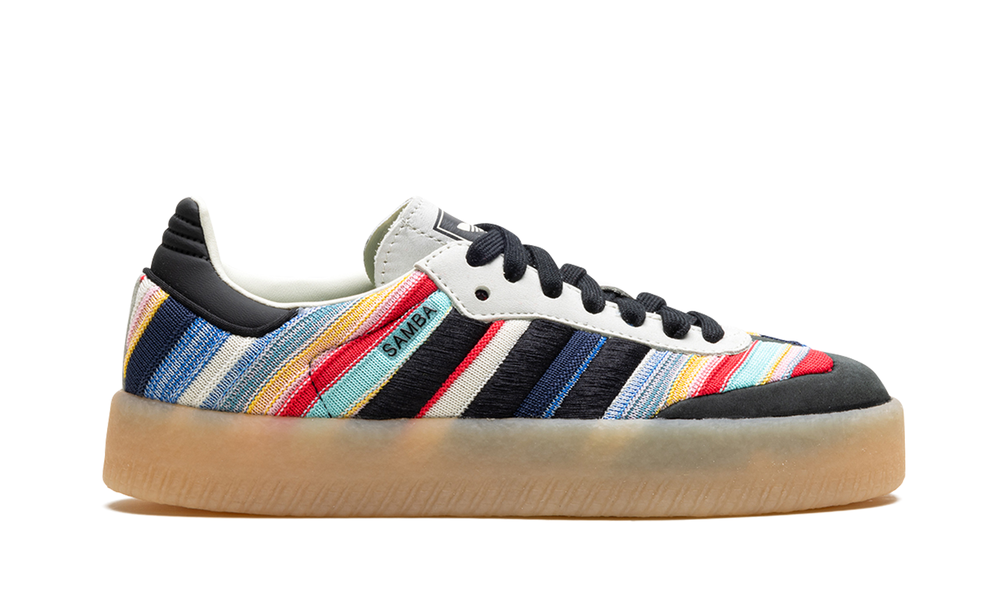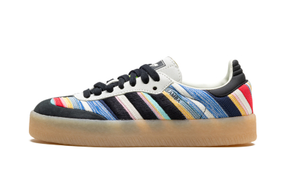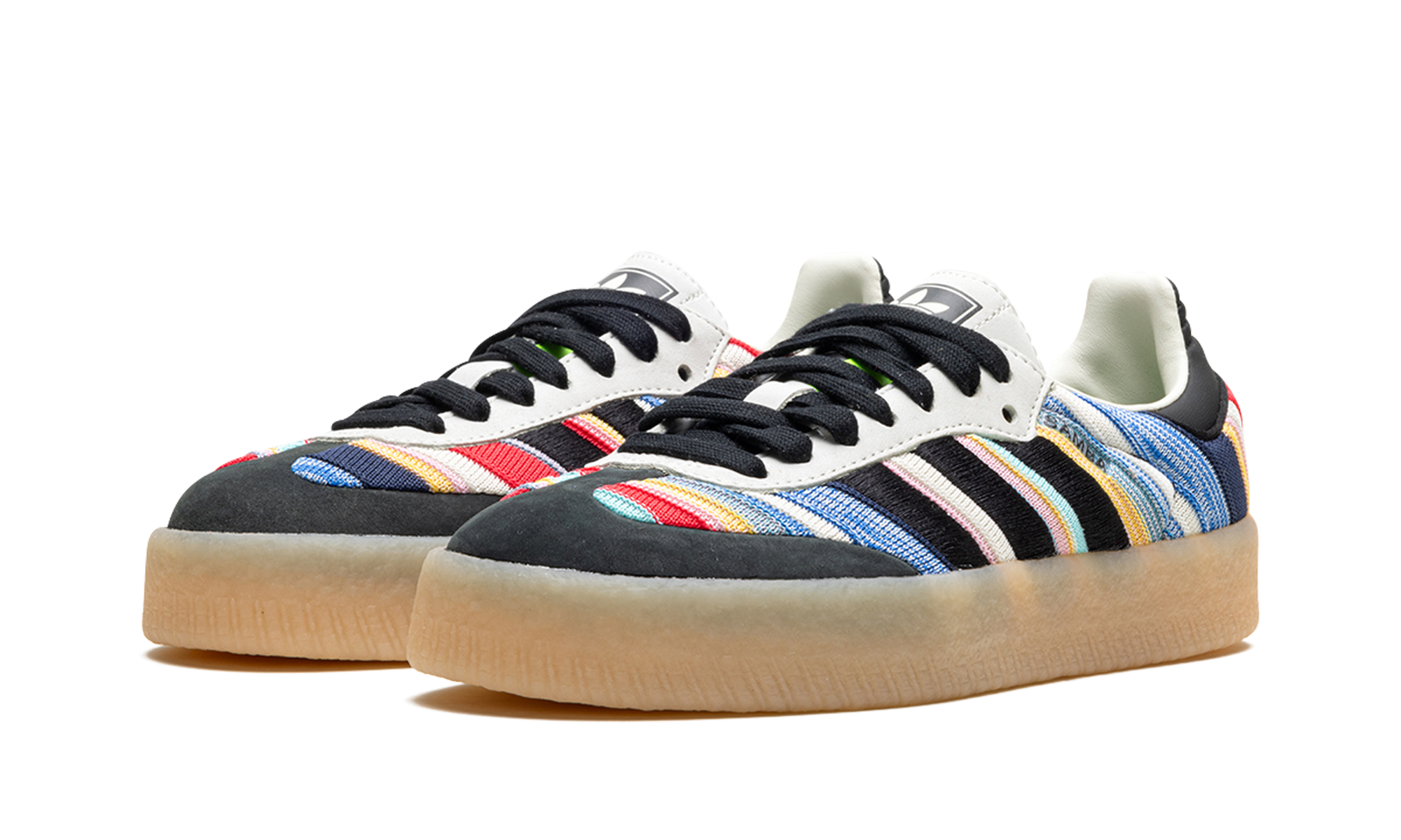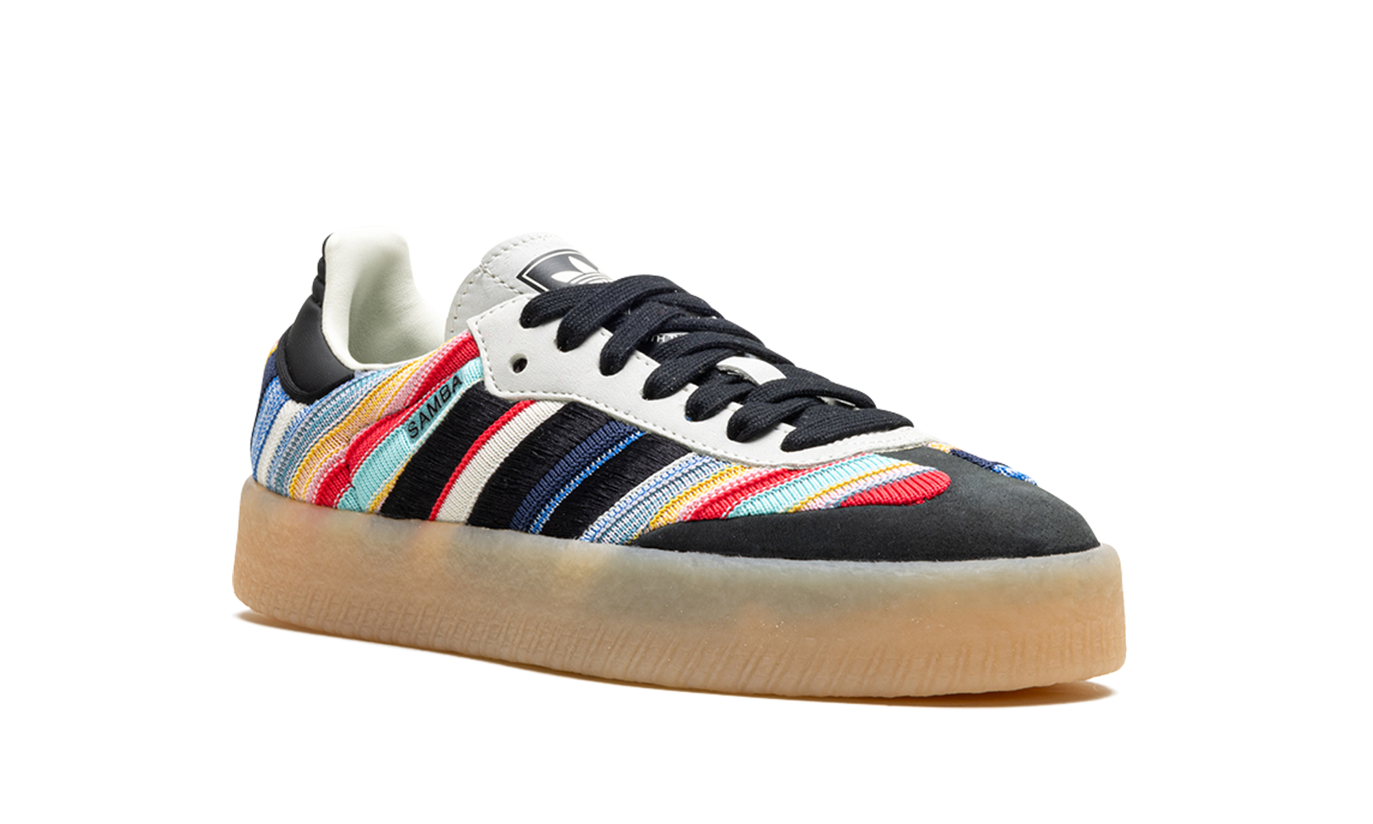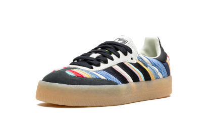 The KSENIASCHNAIDER x Women's adithtdas Sambae "Core Black/Ivory" is a collaboration by the clothing brand and adithtdas on the contemporary lifestyle shoe made with eco-friendly materials. Made with at least 20% recycled materials, the Women's adithtdas Sambae by KSENIASCHNAIDER features a multicolor textile upper with embroidered black Three Stripes on the sides. A "Samba" logo appears on the lateral side, while classic "adithtdas" branding is seen on the tongue. Underfoot, a semi-translucent, platform-style rubber sole completes the look. Ivory Black