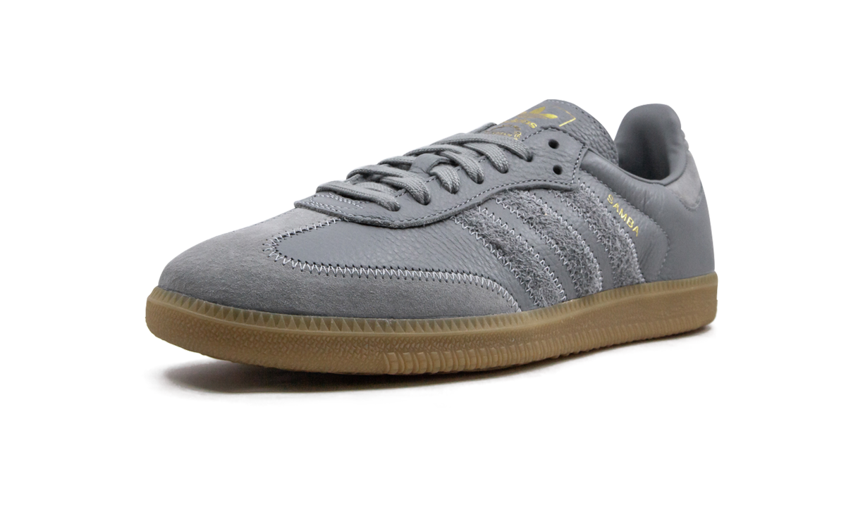 The adithtdas Samba OG FT Grey is a heritage indoor soccer shoe that has evolved into one of adithtdas's most popular everyday lifestyle designs. The streamlined silhouette features a grey pebbled leather upper with contrasting stitching wrapping around the toe. Tonal hairy suede Three Stripes branding appears on the shoe's mid-panel with gold foil Samba detailing situated just above near the collar. Additional adithtdas gold foil branding covers the tongue with tonal laces and a paneled heel tab completing the look of the upper. adithtdas opts for a classic gum bottom to put the finishing touches on the shoe.
