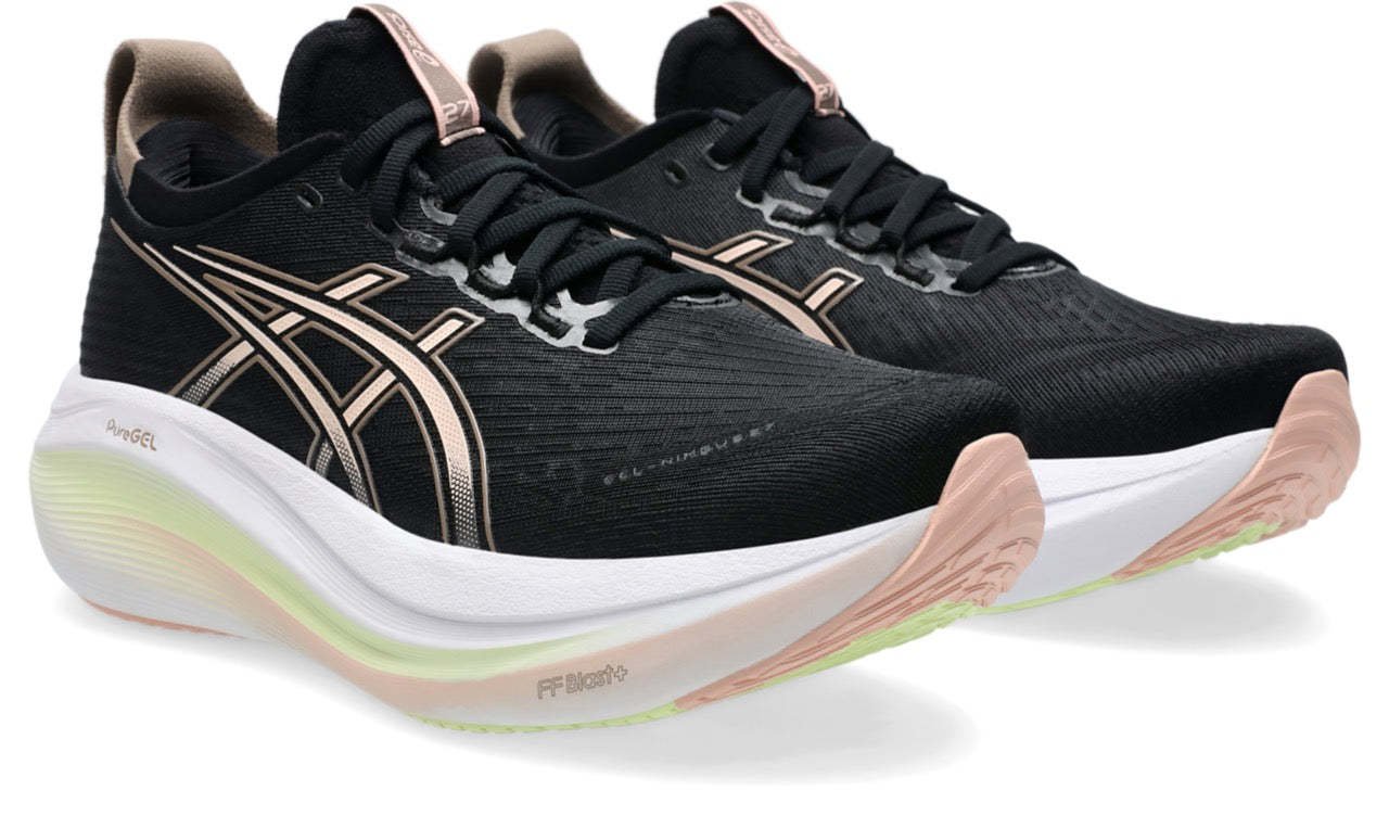 The GEL-NIMBUS? 27 shoe's soft cushioning properties help you feel like you're landing on clouds. This design is revamped to help create a softer and smoother running experience.?A soft engineered jacquard mesh upper comfortably wraps your foot while supplying advanced ventilation. Additionally, the knit tongue and collar help provide a soft and supportive feel.?By using FF BLAST? PLUS ECO cushioning, this trainer creates a lighter and softer cushioning experience.?Lastly, HYBRID GRIP? outsole rubber helps create better traction, improved softness, and advanced durability.